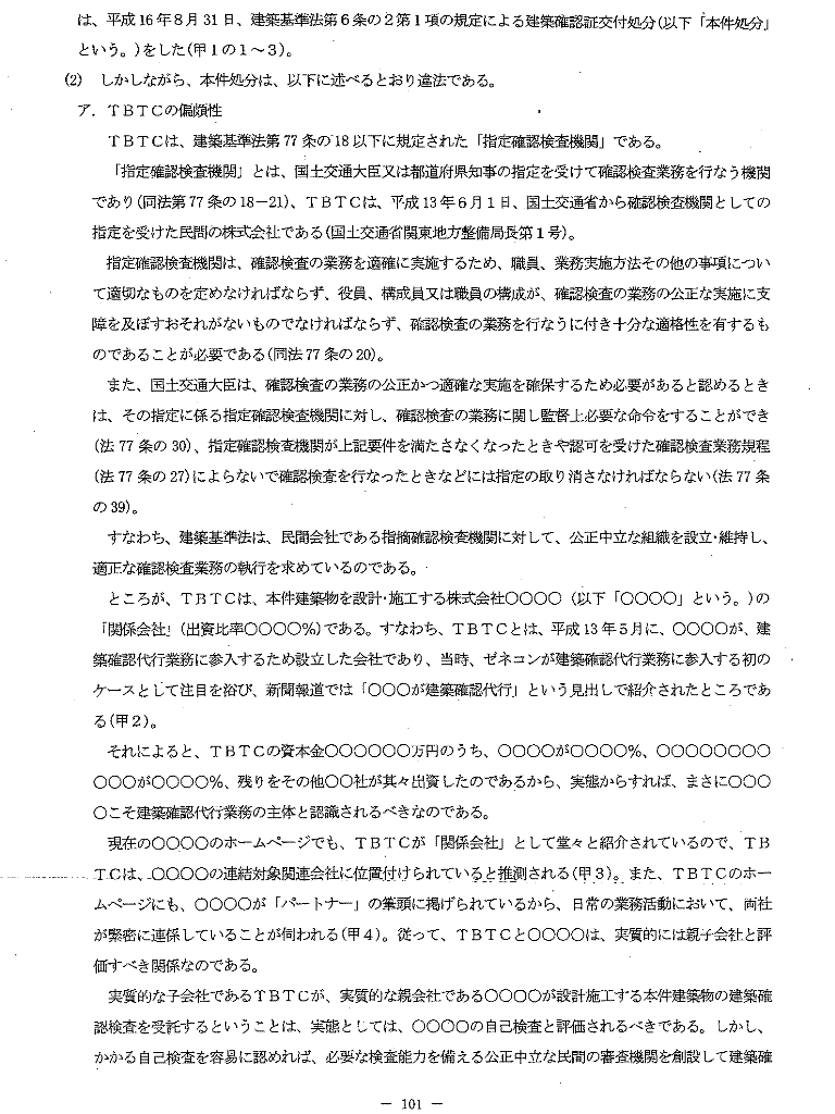 TBTCは、建築基準法第77条の18以下に規定された「指定確認検査機関」である。 「指定確認検査機関」とは、国土交通大臣又は都道府県知事の指定を受けて確認検査業務を行なう機関であり(同法第77条の18~21)、TBTCは、平成13年6月1日、国土交通省から確認検査機関としての指定を受けた民間の株式会社である(国土交通省関東地方整備局長第1号)。 指定確認検査機関は、確認検査の業務を適確に実施するため、職員、業務実施方法その他の事項について適切なものを定めなければならず、役員、構成員又は職員の構成が、確認検査の業務の公正な実施に支障を及ぼすおそれがないものでなければならず、確認検査の業務を行なうに付き十分な適格性を有するものであることが必要である(同法77条の20)。 建築基準法は、民間会社である指定確認検査機関に対して、公正中立な組織を設立・維持し、適正な確認検査業務の執行を求めているのである。 ところが、TBTCは、平成13年5月に、清水建設が、建築確認代行業務に参入するため設立した会社であり、当時、ゼネコンが建築確認代行業務に参入する初のケースとして注目を浴び、新聞報道では「清水建が建築確認代行」という見出しで紹介されたところである。 それによると、TBTCの資本金1億8000万円のうち、清水建設が43.3%、オリックス・キャピタルが19.4%、残りをその他10社が其々出資したのであるから、実態からすれば、まさに清水建設こそ建築確認代行業務の主体と認識されるべきなのである。