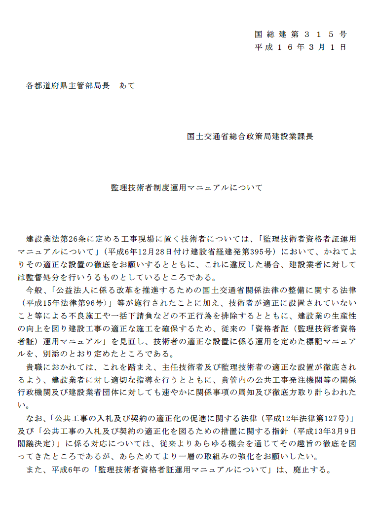 国土交通省総合政策局建設業課「監理技術者制度運用マニュアル」の記事に、