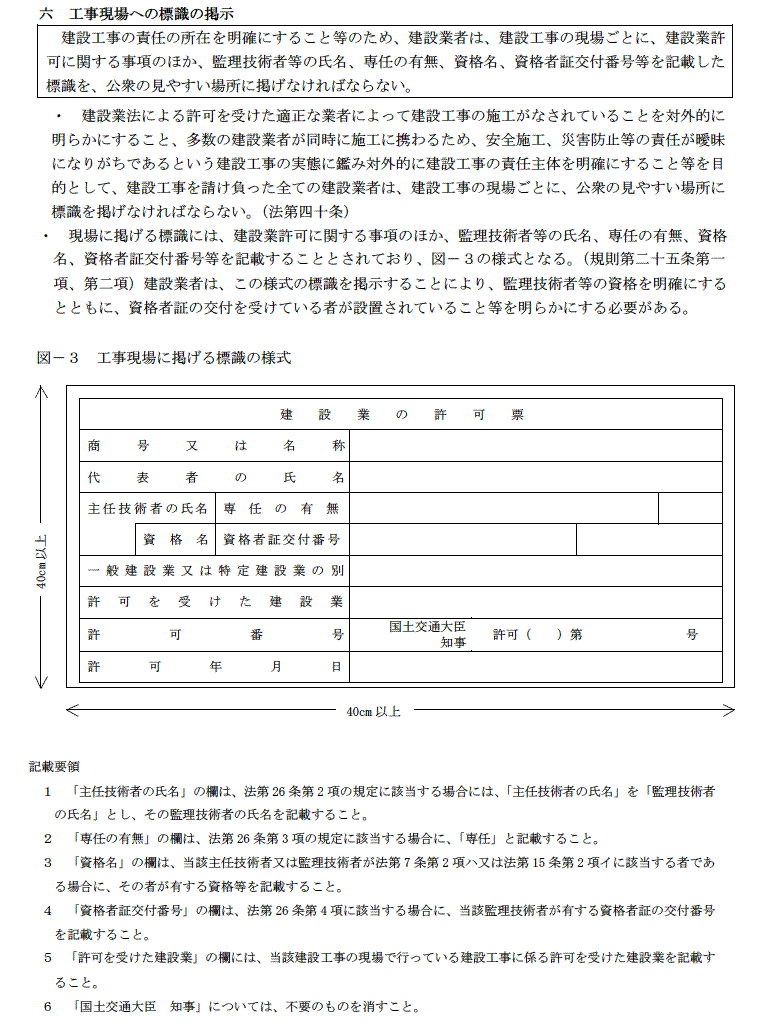 ※ http://www.mlit.go.jp/ から引用 建設業法第40条では、「建設業者は、その店舗及び建設工事の現場ごとに、公衆の見易い場所に、国土交通省令の定めるところにより、許可を受けた別表第一の下欄の区分による建設業の名称、一般建設業又は特定建設業の別その他国土交通省令で定める事項を記載した標識を掲げなければならない。」と規定している。この標識には、監理技術者の資格登録番号も記載されている。 国土交通省総合政策局建設業課平成16年3月1日付「監理技術者制度運用マニュアル」において、「建設業者は、この様式の標識を掲示することにより、監理技術者等の資格を明確にするとともに、資格者証の交付を受けている者が設置されていること等を明らかにする必要がある」との判断が示されている。 堀坂道路拡幅部の修繕工事の現場に、 建設業法第40条に基づく「建設業の許可票」の標識が掲げられていないようです。 現場責任者が資格者証の交付を受けた者であると明示されていません。 建設業者に対して、東京都、文京区が指導をしているのか、気になります。