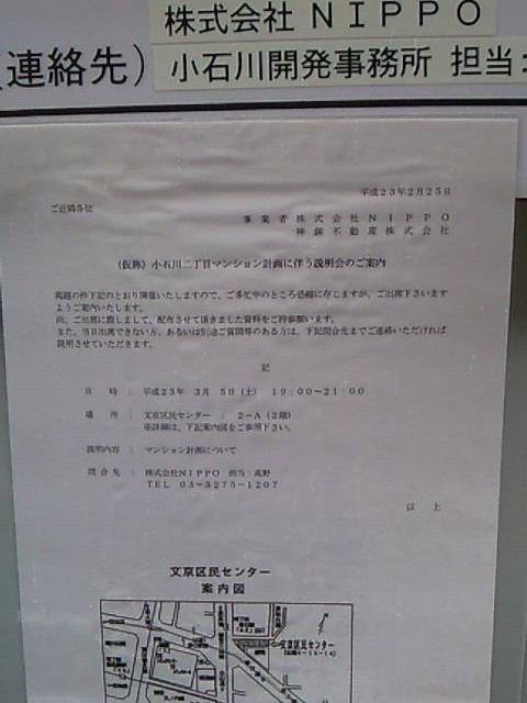 ※9年前の(仮称)小石川二丁目マンション建築計画に関する文書 (仮称)小石川二丁目マンション建築計画は、 元々は、清水建設による設計施工でした。 清水建設OBらが設立した 有限会社建築計画環境問題研究所一級建築士事務所が 総合企画と称して近隣交渉を行っていました。 上記文書の標識設置届の連絡先には 有限会社建築計画環境問題研究所の常務取締役が記載されています。 近隣交渉担当者の起こした事件を含め 9年前の(仮称)小石川二丁目マンション建築計画の問題については 別の機会にしますが、 清水建設には 堀坂、六角坂の周辺環境に 十分に配慮していただきたかったです。 NIPPOさん、神鋼不動産さん、日建ハウジングシステムさん、安藤ハザマさん、 堀坂、六角坂の周辺住民は 静謐で整然とした小石川の町並みに ふさわしいマンション建設を求めています。