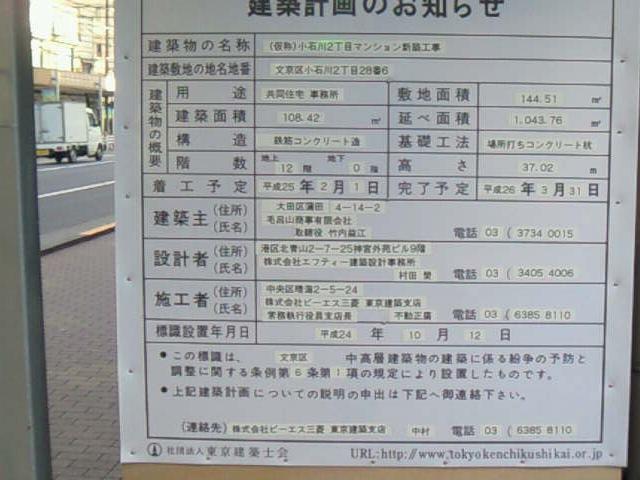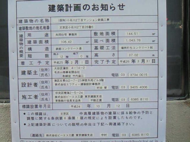 ※ 小石川2-24-14付近 建築物の名称 (仮称)小石川2丁目マンション新築工事 建築敷地の地名地番 東京都文京区小石川二丁目28番6 建築物の概要 用途 共同住宅 敷地面積 144.51m2 建築面積 108.42m2 延べ面積 1,043.76m2 構造 鉄筋コンクリート造 基礎工法 場所打コンクリート杭 階数 地上12階 高さ 37.02m 着工予定 平成25年2月1日 完了予定 平成26年3月31日 建築主 東京都大田区蒲田4-14-2 毛呂山商事有限会社 取締役 竹内 益江 03(3734)0015 設計者 東京都港区北青山2-7-25 神宮外苑ビル9F 株式会社エフティー建築設計事務所 村田 栄 03(3405)4006 施工者 東京都中央区晴海2-5-24 株式会社ピーエス三菱 東京建築支店 常務執行役員 不動 正廣 03(6385)0110 標識設置年月日 平成24年10月12日