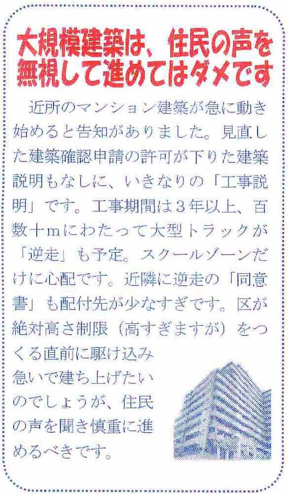 萬立議員 容積率や前面道路、日影規制などの法にのっとっている建築計画においても、現状では紛争が絶えません。それなのに、絶対高さの原則値の根拠を「容積率を活用できる高さ」にするのでは、紛争解決になりません。茅ヶ崎市では、実際の紛争時の協議の結果から概ね5階程度であれば許容できるという意見が多かったことを受け、中高層住居専用地域は15m、5階建ての高度地区を指定しています。また、尼崎市では、建築紛争が発生する地域の高さを調査し、概ね6階より高いものから紛争が起きていることを確かめ18m、6階建てに高さ制限値を変更しています。敷地面積が1,000m2以上の場合に24mまで制限値が緩和されますが、この数値も紛争実態を調査した結果、概ね8階より高いものが多かったとの統計データから決定し、これも紛争実態を反映して決めています。 区はこの間の区内の建築紛争を検証し、近隣住民がどれくらいの高さを希望して声をあげたのか、その紛争地域の実態を調べ直すことが必要ではないでしょうか。そして、当該住民の望む許容できる高さを練り直すべきです。併せて伺います。 白山通り沿道の高さ制限案は、47m15階建て相当です。しかしこの間、建築紛争が起こった千石地域では「せめて8~9階ぐらい」というのが近隣住民の要望でした。準工業地域という理由で「制限値」を32mに引き上げた千川通りでは、平成20年3月に35mのマンション計画に住民が反対し、現在着工がストップしている計画があります。この地域では「5年後には千川通り沿いの印刷、製本業はなくなる」とも言われていますが、そんな状況を見てデベロッパーが土地を買いあさり、まち壊しをさらに助長することも予想されます。住宅地では、現在係争中の小石川2丁目計画は9階建て32mですが、住民は高さ20m以下を要望しています。 こうした地域の積年の要望は、どのように反映されたのでしょうか。第一次素案は、地域住民との関係では住環境を守るうえでの適正な高さ制限にはなりません。その地域で生活する者の視点から、「これ以上高いのは困る」という基準を住民参加で決めるべきではないか、伺います。 成澤区長 まず、容積率と絶対高さ制限の関係等についてのお尋ねですが、容積率は、地域ごとに活用できる限度を都市計画に定めているもので、絶対高さ制限の「原則値」は、それを前提に算定していることから、妥当なものと考えており、3つの目的にも沿うものと認識しております。また、過去の紛争や市街地の実態などについても踏まえた上で定めたものです。なお、絶対高さを指定したとしても、地域住民の合意形成が図られるのであれば、地区計画を活用した高さ規制によって、それを絶対高さの数値として読み替えることができることになっております。 NIPPOさん、神鋼不動産さん、 日建ハウジングシステムさん、 高さを下げて、堀坂や隣地境界から離隔をとってください。