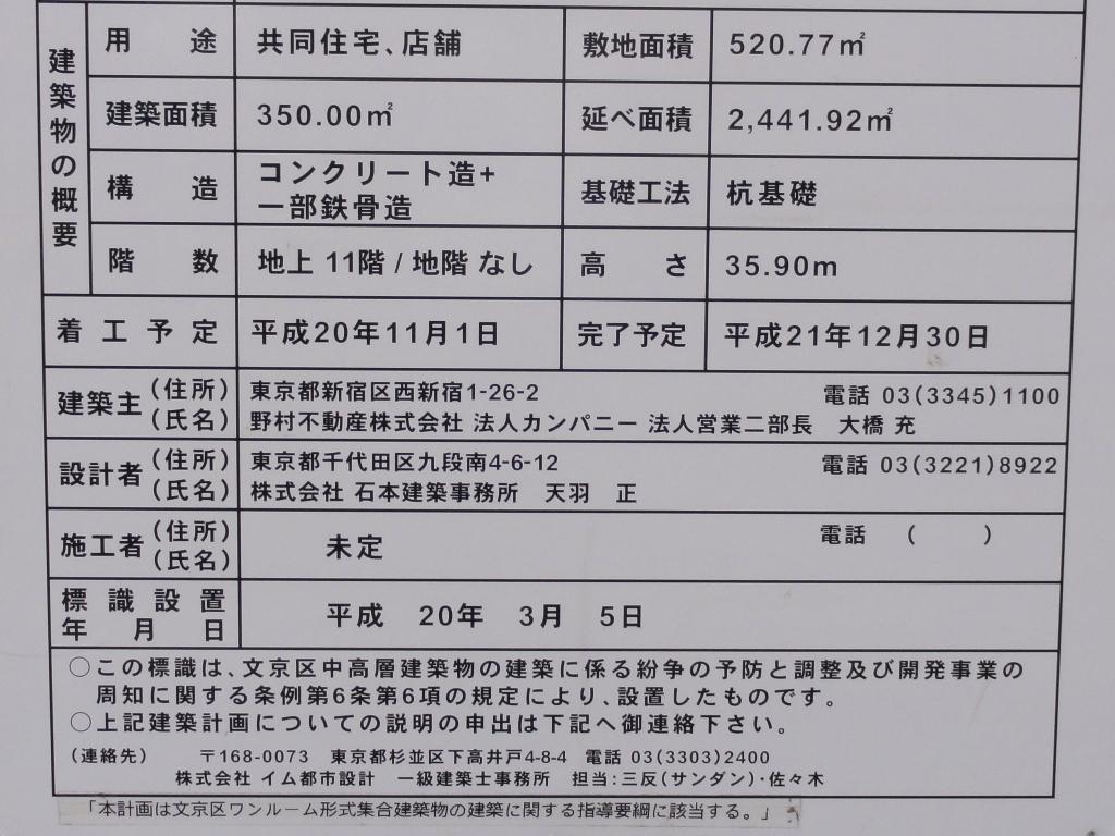 本題です。 小日向プロジェクトの近く(文京区小石川3-36付近)で見かけたポスターと 野村不動産「(仮称)小石川3丁目計画」の標識です。 文京区内では 周辺住民ともめている事例が多すぎます。 建築計画のお知らせの標識に 「本計画は文京区ワンルーム形式集合建築物の建築に関する指導要綱に該当する。」 と記されています。 文京区ワンルームマンション等の建築及び管理に関する条例の施行から すでに2年以上が経過しています。 文京区指導課は条例に沿った指導をしないでよいのでしょうか。 ☆野村不動産「(仮称)小石川3丁目計画」の問合せ先(株式会社イム都市設計)は、 株式会社イム測量設計の関連会社です。