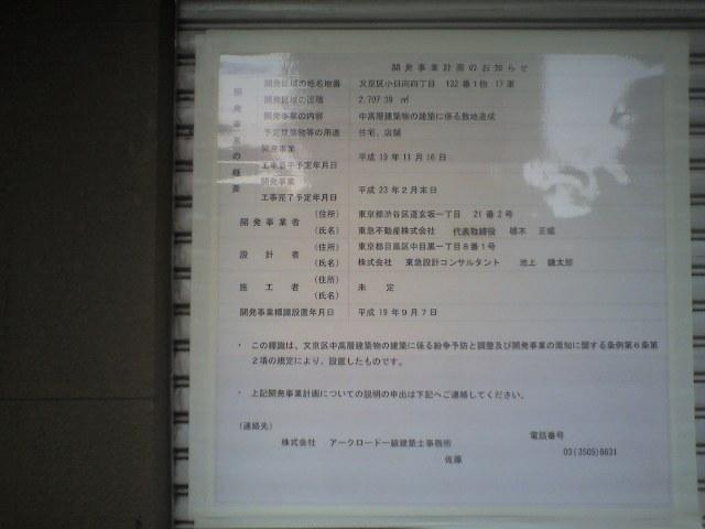 2007年10月に撮影した「小日向プロジェクト」の開発事業のお知らせ標識
