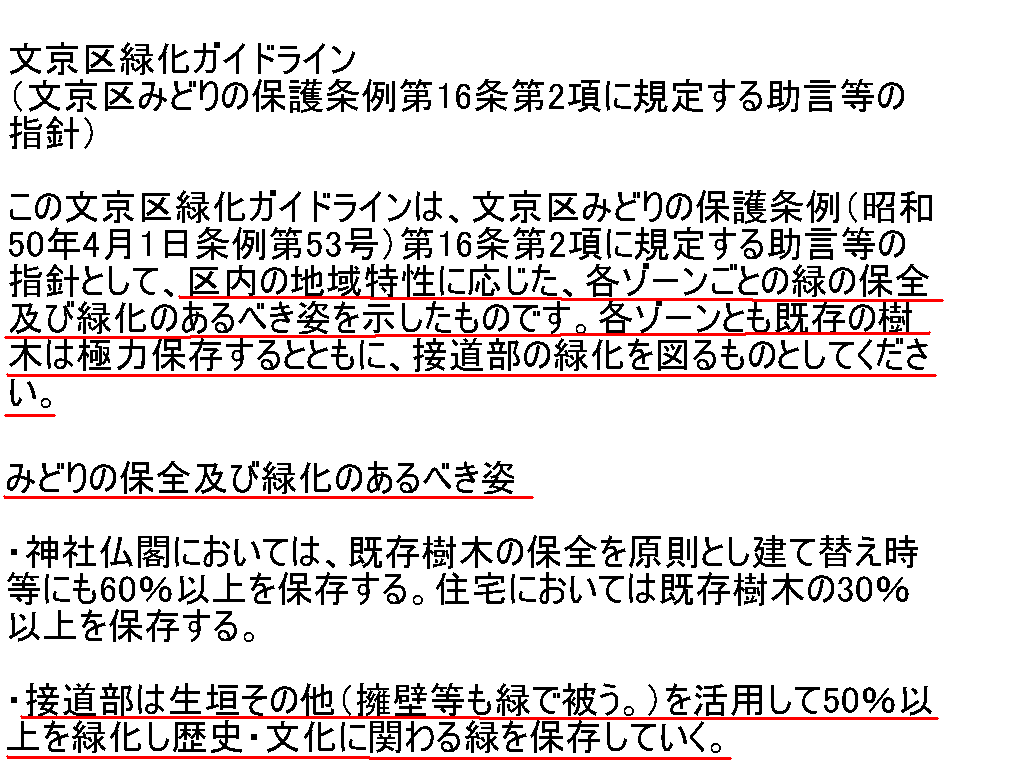 文京区緑化ガイドライン (文京区みどりの保護条例第16条第2項に規定する助言等の指針) この文京区緑化ガイドラインは、文京区みどりの保護条例(昭和50年4月1日条例第53号)第16条第2項に規定する助言等の指針として、区内の地域特性に応じた、各ゾーンごとの緑の保全及び緑化のあるべき姿を示したものです。各ゾーンとも既存の樹木は極力保存するとともに、接道部の緑化を図るものとしてください。 1. 歴史・文化の集積が高いゾーン 住居専用地域並びに住居地域 (後楽一丁目の一部、春日一丁目の一部、小石川二・三・四丁目の一部、白山五丁目の一部、向丘二丁目の一部、根津二丁目の一部、千駄木一・二・三・四・五丁目の一部、本駒込一・二・三・四・五丁目の一部) 現況 神社・仏閣や路地に代表される下町の風情や史跡など、江戸期以降の歴史・文化の蓄積が多く、これらが緑を彩っています。 みどりの保全及び緑化のあるべき姿