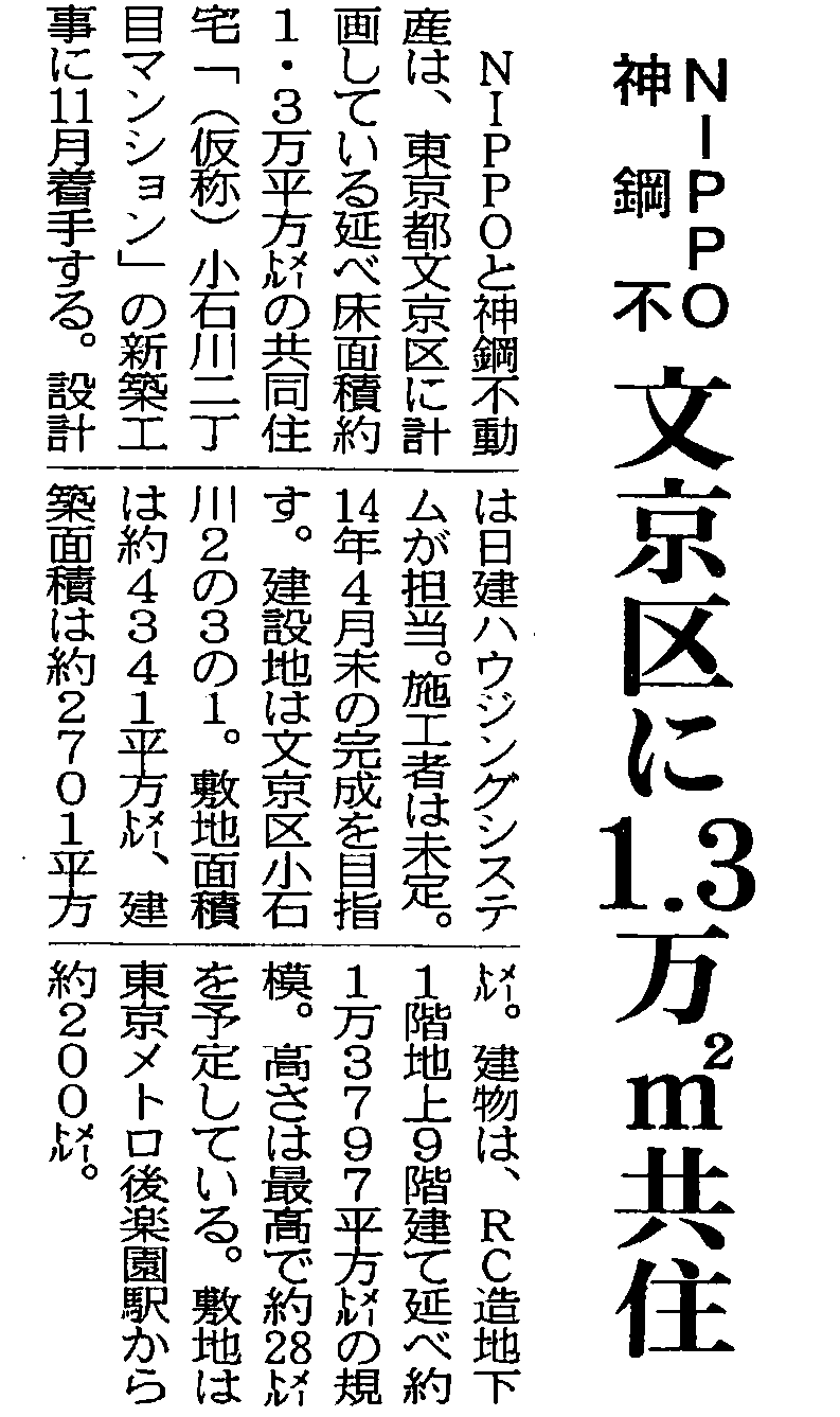 NIPPOと神鋼不動産は、東京都文京区に計画している延べ床面積約1.3万平方メートルの共同住宅「(仮称)小石川二丁目マンション」の新築工事に11月着手する。設計者は日建ハウジングシステムが担当。施工者は未定。14年4月末の完成を目指す。