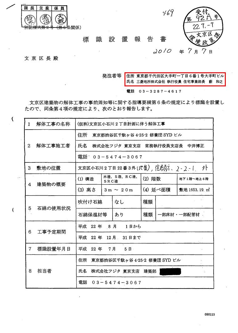 ※解体工事の標識設置報告書 東横インの南側で 株式会社フジタが「(仮称)文京区小石川二丁目計画」に伴う解体工事を行っています。 解体工事の標識設置報告書によると 吹付け石綿は「なし」、石綿保温材等は「あり」とのことです。 時間をかけてでも 細心の注意を払って解体していただかないと困ります。 やや気になったのは 解体工事の発注者が三菱地所と記載されていることです。 その2日前に出された建築標識設置届によると、 建築主はフジタと記載されています。