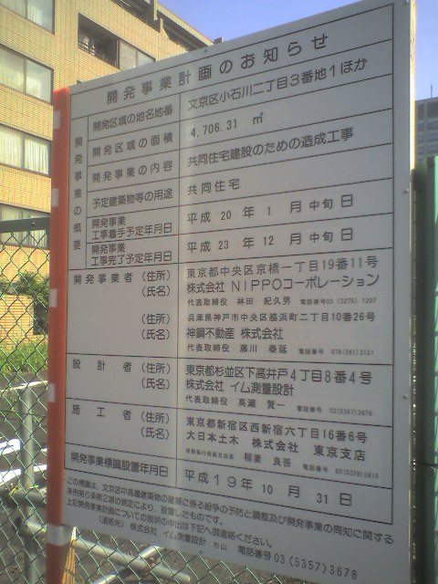 共同住宅建築計画の設計者は、清水建設でした。 平成19年12月には 清水建設の共同住宅設計図に基づいて 諸官庁との事前協議がされていたそうです。 しかし、事業者から周辺住民に 共同住宅建築計画の説明がありませんでした。 その翌年に 清水建設は撤退しました。 現在の開発事業のお知らせ標識では 連絡先(イム測量設計の担当者)も変更されています。 事業者の共同住宅建築計画を説明しない姿勢は 現在も続いています。