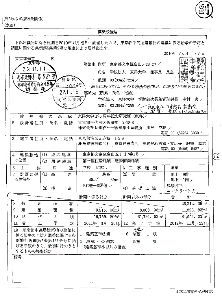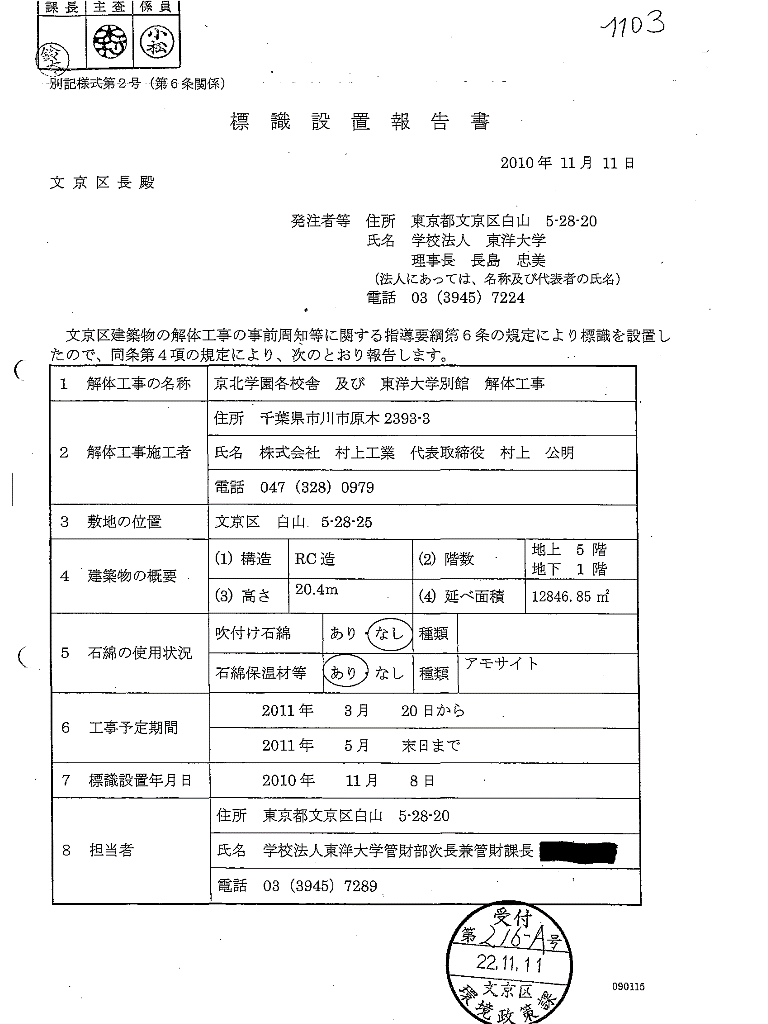 京北学園の校舎を解体して、そこに 東洋大学の研究棟(高さ 39m、延べ面積 約2万m2)を建てる計画です。 設計者は日建設計、施工者は鹿島建設です。 近隣住民への説明が十分でないようです。 東京都と文京区には事業者への指導をしていただきたいです。 解体工事の標識設置報告書によると 吹付け石綿は「なし」、石綿保温材等は「あり」とのことです。 時間をかけてでも 細心の注意を払って解体していただかないと困ります。