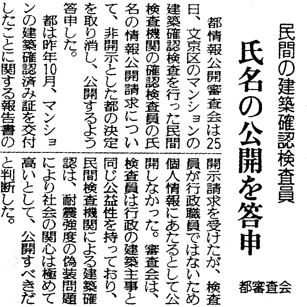 ※ 読売新聞 2006年7月26日朝刊 から引用 都情報公開審査会は25日、文京区のマンションの建築確認検査を行った民間検査機関の確認検査員の氏名の情報公開請求について、非開示とした都の決定を取り消し、公開するよう答申した。 都は2005年10月、マンションの建築確認済み証を交付したことに関する報告書の開示請求を受けたが、検査員が行政職員ではないため個人情報にあたるとして公開しなかった。 審査会は、検査員は行政の建築主事と同じ公益性を持っており、民間検査機関による建築確認は、耐震強度の偽装問題により社会の関心は極めて高いとして、公開すべきだと判断した。