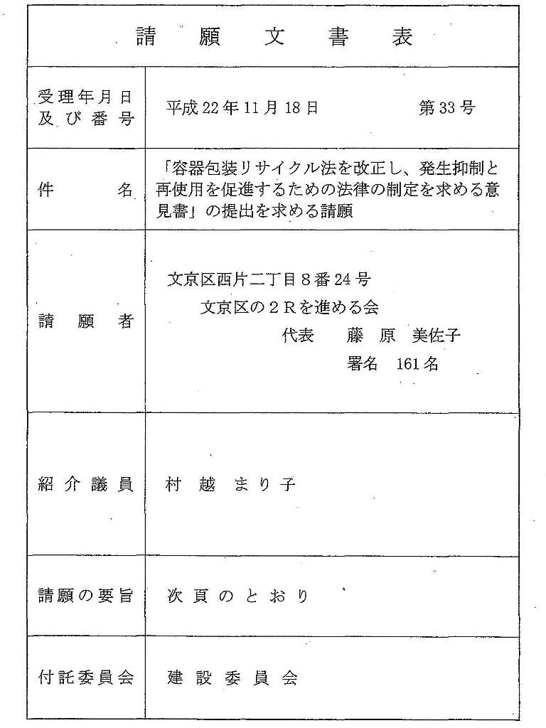 ○白石委員長 それでは、各会派の態度表明をお願いいたします。 まず、自由民主党さん。 ○海老澤委員 自由民主党は、趣旨は賛成でございます。とてもいいことですし、特に1番の容器リサイクル法の役割分担の見直しということは、区でも国に要望していることなのでいいとは思うのですが、回収の自治体の費用が増加する可能性があるのではないかと思われ、今回、1については保留とさせていただきます。2については、次のようなさまざまな制度ということが抽象的であり、まだ考えなくてはいけないことが残されているのかと思いますので、不採択とさせていただきます。 3につきましても、新たな法制度というところが私たちとしましては抽象的だということで、今回は不採択とさせていただきたいと思います。 ○白石委員長 それでは、民主クラブさん。 ○高山委員 民主クラブは、まず請願事項1番は、製品に内部化するということで、容器包装をつくっている業者さんも中小企業さんとかもあるし、中小企業対策とか、さっき言った自治体の負担とか、いろいろな問題もありますので、これは保留。2番は、3つ具体的にありますけれども、特に(1)レジ袋など使い捨て容器の無料配布禁止というのは、なかなかこれは難しいのかというので、2については不採択。請願事項3番は、2Rが大事だという考え方そのものは分かるんですが、それをまた別立てで法制化する、今、容器リサイクル法の改正案もいろいろ審議されていますので、全体の議論を見ながらやっていったほうがいいのではないかというふうに私は思いますので、3番は保留ということでお願いをいたします。 ○白石委員長 日本共産党さん。 ○高畑委員 1番は採択、内部化するということは採択。リデュース・リユース促進のためという2項なんですが、(1)(2)(3)とありますよね。これ、一つひとつでいいんですか。 ○白石委員長 2は2なんです。 ○高畑委員 2は2。 先ほど、レジ袋の点で浅田委員が質問したときに、今、マイバッグだとか、そういう努力してということではないけれども、マイバッグはいつも持っていますという方もいらっしゃるし、無料で配布ということでないと有料になりますよね。いろいろなところで、1袋5円です、10円ですというふうになっていて、私は有料化したところでごみは減らないのではないかと思います。このところだけありますので、この1点を保留ということで、2は保留になります、全体で見れば。3番目は採択をさせていただきます。 ○白石委員長 浅田委員。 ○浅田委員 最近、東京新聞とか読売新聞で、文京区の職員の学校用務の方が随分リサイクル、堆肥化に取り組んでいて、今、東大と一緒に堆肥化に取り組んでいるとかという話を見たりしていて、以前、同じ仲間だったんですけれども、随分広がっていると感じている。どうしてできるんですかと聞いたら、結局だれかが始めないとだめだということなんですよ。それは、僕がいればやっていますけれども、やろうと思います。つまり、そういうことがやはり必要だろうと思うんですね。もちろん、最後については難しいかというふうに思うことがあるかもしれません。だけれども、本当に大切な課題になってきているという趣旨、これを私は全面的に支持をしたいと思います。したがいまして、1・2・3ともに採択をいたします。 ○白石委員長 公明党さん。 ○若井副委員長 私たちといたしましては、1の趣旨は私たちもよく理解はできるんですが、しかし、この社会情勢を踏まえながら、つくっている側にとなると、下請さん、また下請で雇用されている方々、そういうところのことをよく考えると、そういうところにしわ寄せが行く可能性もある、そういう部分からいくと、一概に採択はできないので、保留させていただきます。2項に関しましても、理解できる部分、それからううんという部分も踏まえ、この(1)(2)(3)が全部いいかといいますと、これもそうではないので、これは不採択。3番につきましても、新たな法制度化、これが少し内容が不透明な部分もありますので、この部分の3に対しても不採択と、そうさせていただきます。 ○白石委員長 それでは、態度表明の結果ですが、まず、請願事項1につきましては、採択2、保留5、不採択ゼロで保留とさせていただきます。請願事項2につきましては、採択1、保留1、不採択5で不採択。請願事項3につきましては、採択2、保留2、不採択3で保留とさせていただきます。 意見書を求める請願でございますので、採択につきましては全会派が一致という要件がございますので、御了承いただきたいと思います。