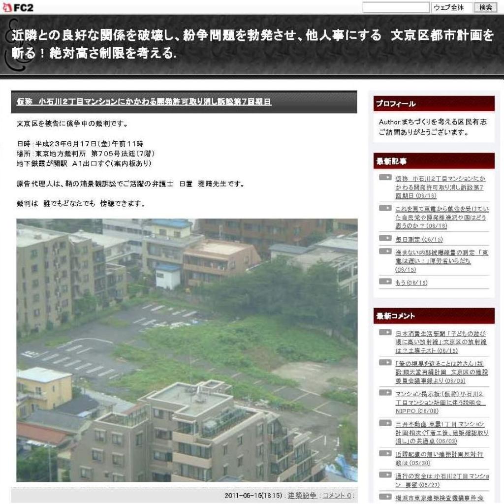 ※ http://lovethesun.blog121.fc2.com/ から引用 小石川2丁目マンション開発許可取消訴訟第7回期日に関連した記事が掲載されました。 ありがとうございます!