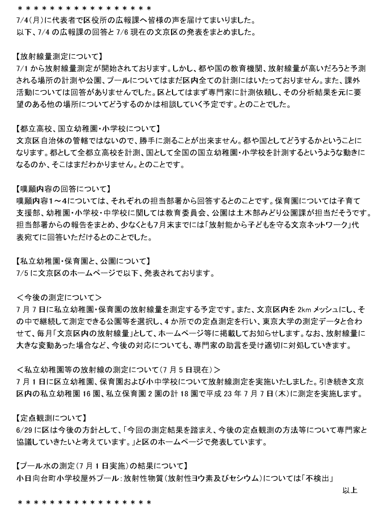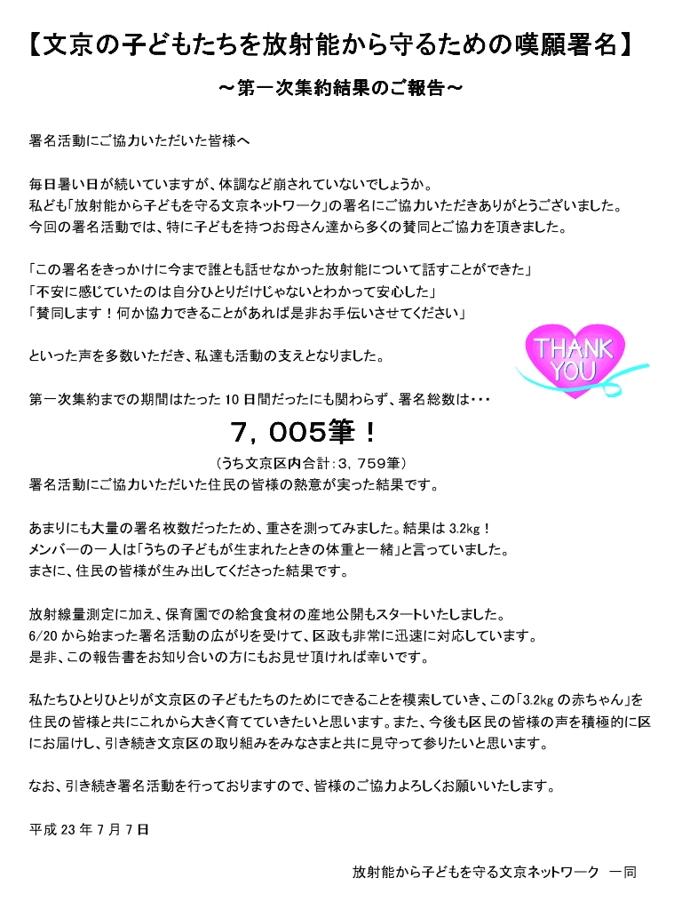 【放射能から子どもを守る文京ネットワーク】 連絡先 bunkyo_net_for_kids@yahoo.co.jp 文京区以外の方の署名も大歓迎とのことです。