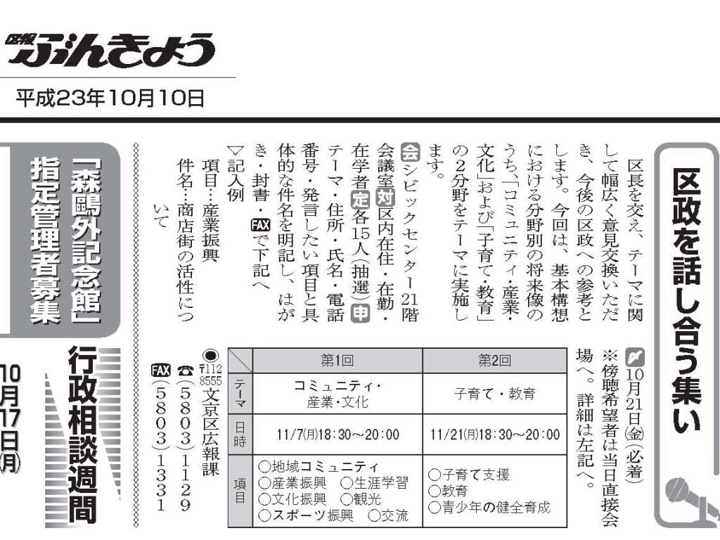 ※ www.city.bunkyo.lg.jp から引用 区長を交え、テーマに関して幅広く意見交換いただき、今後の区政への参考とします。基本構想における、分野別の将来像のうち、「コミュニティ・産業・文化」及び「子育て・教育」の2分野をテーマに実施します。