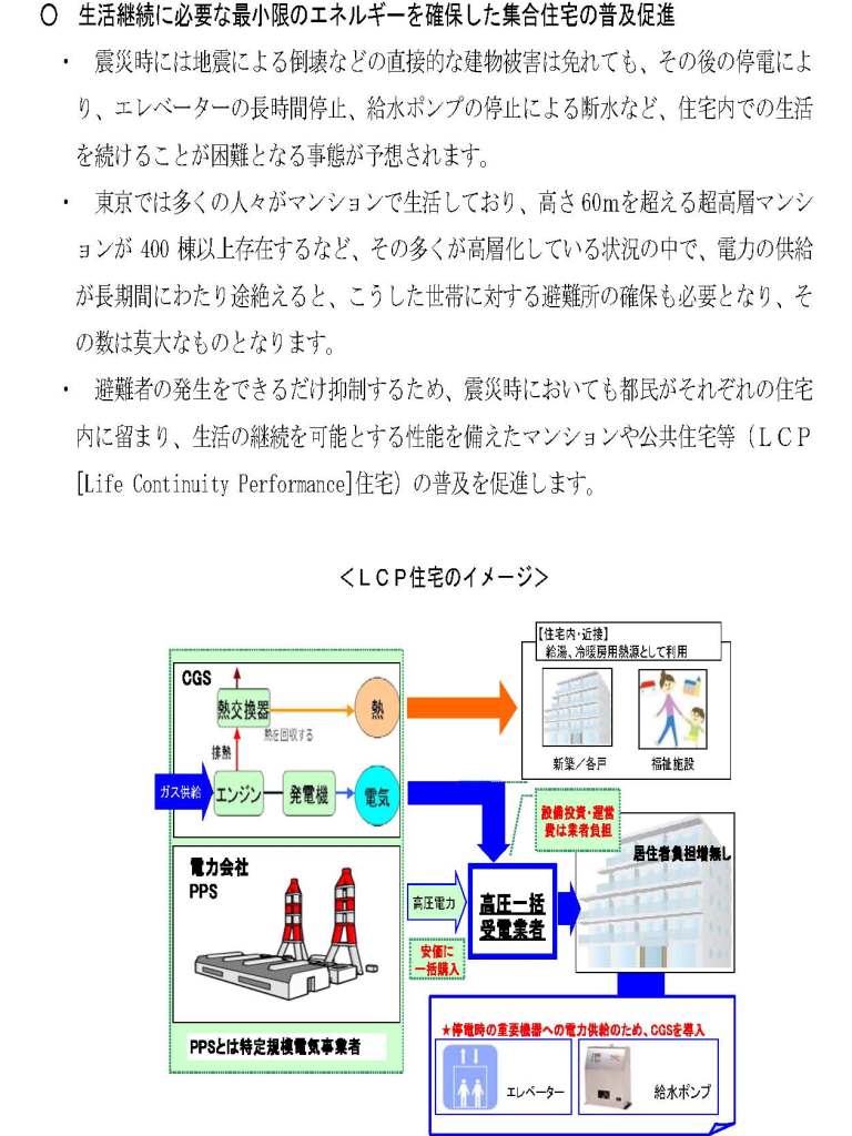 「東京都LCP住宅の登録・閲覧に係る基本方針」について 東日本大震災の際には、建物自体が損傷を受けていなくても、停電があったマンションでは、水の供給やエレベーターの運転が停止し、結果として自宅での生活が継続できないなどの影響がありました。 東京都では、環境に与える影響や都民の経済的な負担などを考慮しつつ、停電時でも水の供給やエレベーターの運転に必要な最小限の電源を確保することで、都民が自宅での生活継続を可能とする住宅(以下、東京都LCP住宅)の検討を進め、あわせて、東京都LCP住宅の情報を提供する方策の検討を進めてきました。 本日(2012年1月23日)、東京都LCP住宅の登録・閲覧に係る基本方針を別紙のとおり、取りまとめましたので、お知らせします。 ※ 東京都LCP住宅の登録・閲覧に係る基本方針 (PDF 144KB)